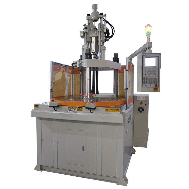立式合模,立式注塑,方便预埋件;多工位圆盘(1个上模,2\3个下模)增加产能;高效盘齿轮传动由平面自润滑耐磨片承载;